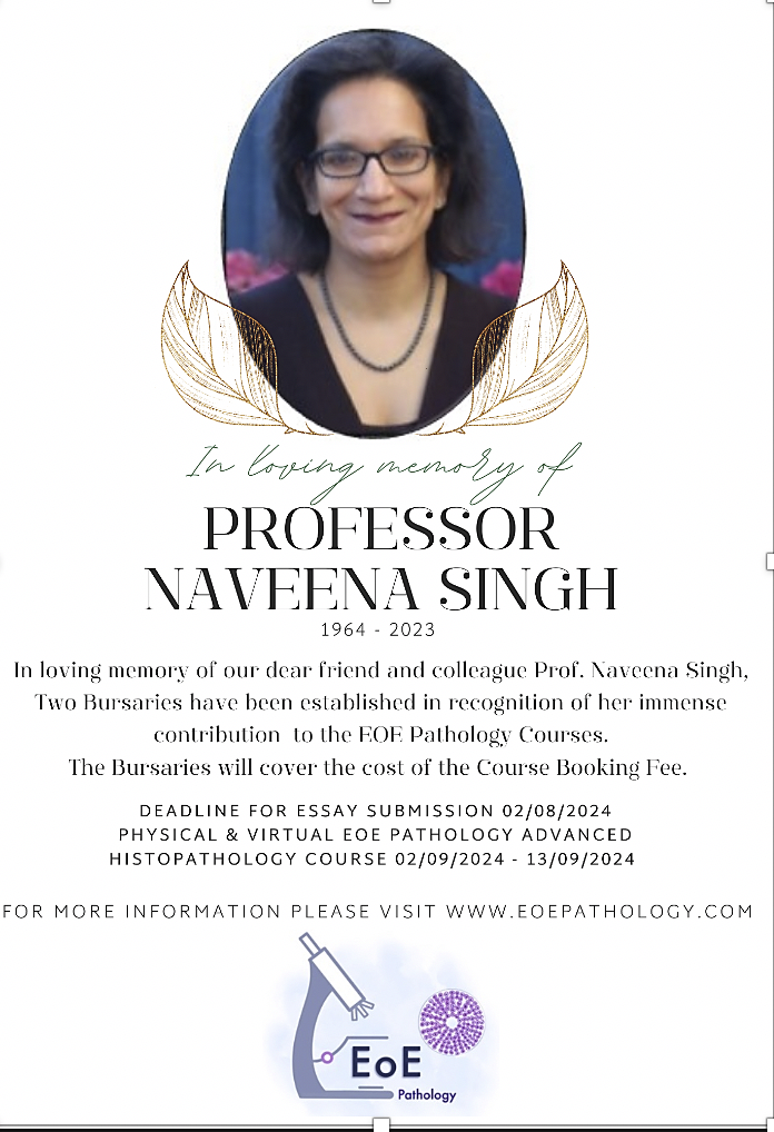 In loving memory of our dear friend and colleague, Professor Naveena Singh (1964–2023), two bursaries (one virtual and one physical attendance) have been established in recognition of her immense contribution to the EOE 2-week Histopathology course.